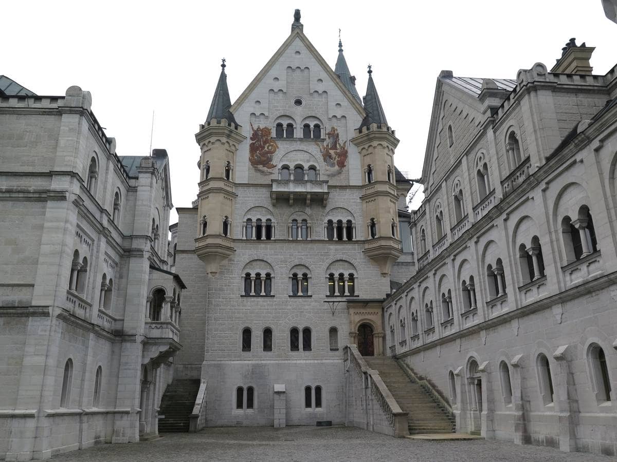 Il vicino castello di Hohenschwangau, ex dimora di Re Ludwig II, è altrettanto elegante pur avendo un aspetto più tradizionale.
